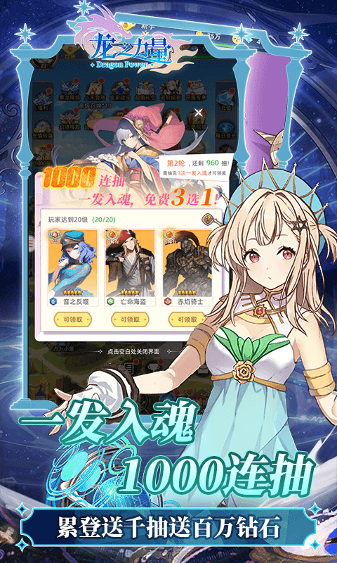 龙之力量首续0.1折是一款西方魔幻二次元卡牌手游,在龙之力量首续0.1折中,玩家开局直升VIP8特权,萌新累登每天都能领取100连抽,开局还有百万钻石和无限真充可以免费领,极品神装也能免费拿