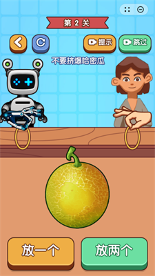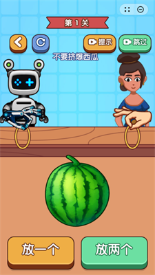 双人绑西瓜是一款趣味逻辑思维闯关游戏,和机器人PK逻辑对决,选择放一个或者两个橡皮筋,不要将关卡中的西瓜挤爆即可。在双人绑西瓜中,全新思维逻辑挑战,多样玩法等你来解锁,让你享受游戏的快乐。