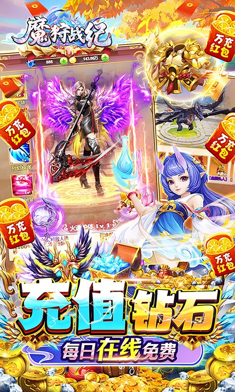 魔狩战纪0.1折万充红包是一款魔幻二次元MMO手游,在魔狩战纪0.1折万充红包中,玩家上线就可以领取SVIP、88888钻石以及一千万金币,首日登录送地狱飞龙,七日登录送神级幻魂舞姬,每日登录签到送充值送钻石