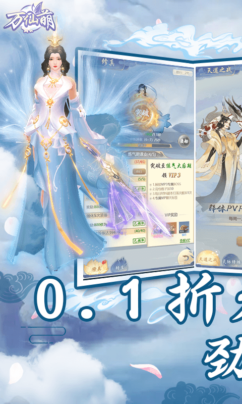 万仙萌0.1折是一款国风放置修真手游,在万仙萌0.1折中,玩家上线直接免费领取VIP特权,提升境界就可以提升VIP等级,另外登录还有时装外观、元宝、神装碎片等豪礼,福利号每日可领代金券,还有海量材料、海量资源可以白嫖