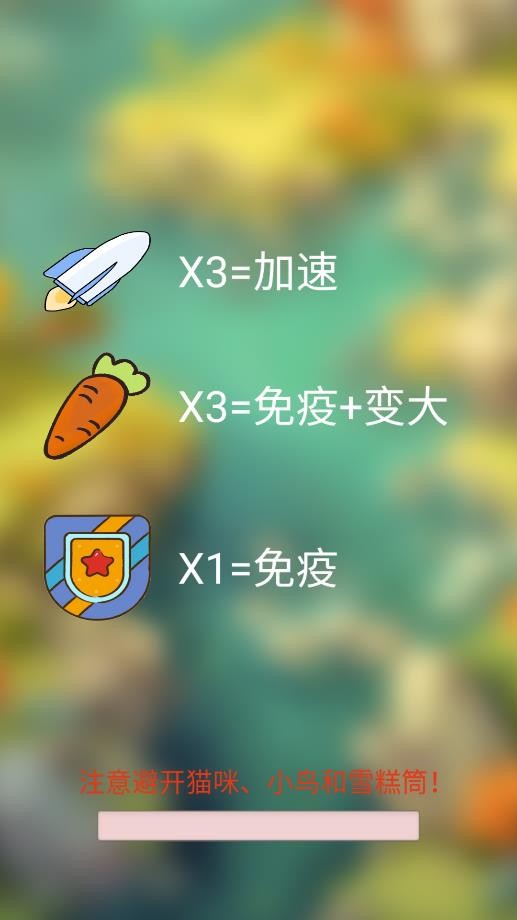 2.游戏中有各种有趣的道具,沿途散落着可口的胡萝卜,尽量收集它们,增加得分和生命值。