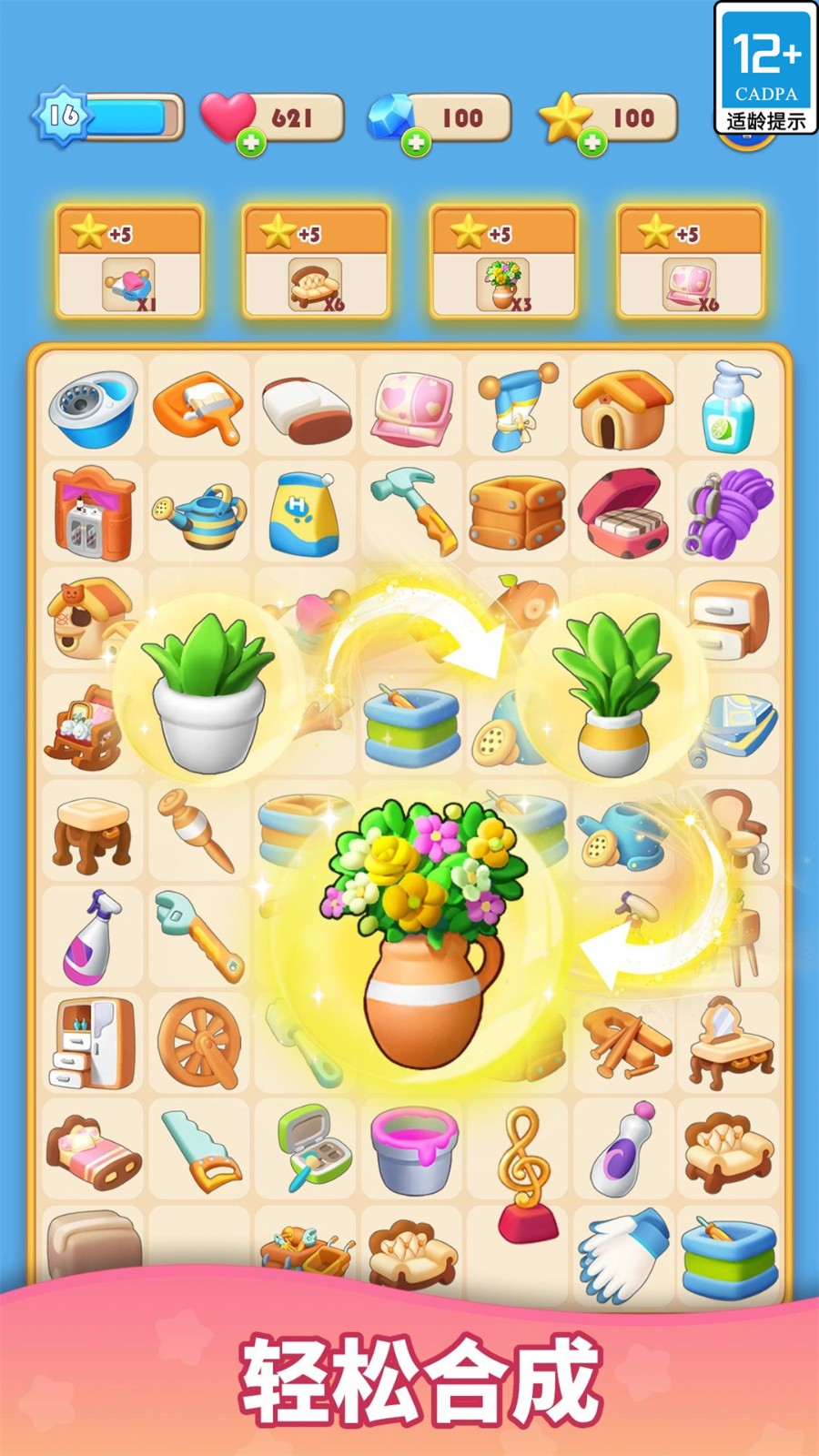 1.将相同的道具合成可以升级获得新的物品,不断合成可以解锁更多工具和物品