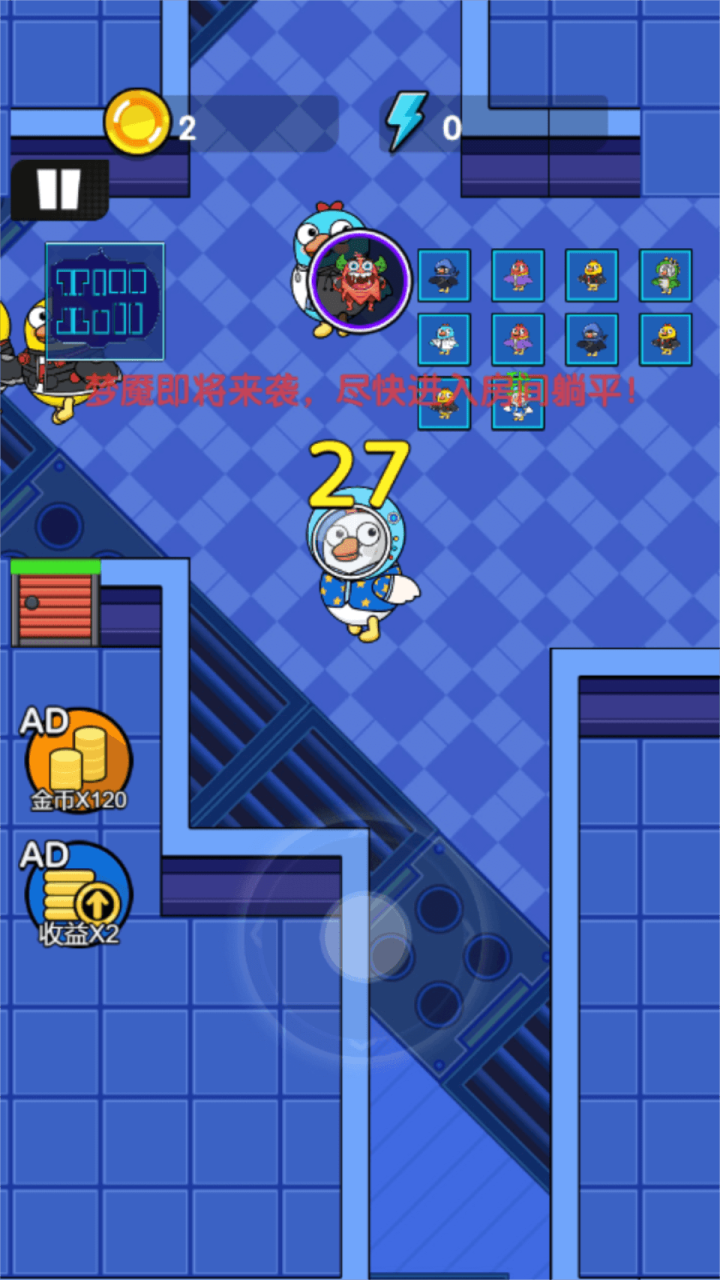 2、观察猛鬼:在躲避猛鬼时,仔细观察它们的移动方式,找到躺平小鸭子的最佳时机。