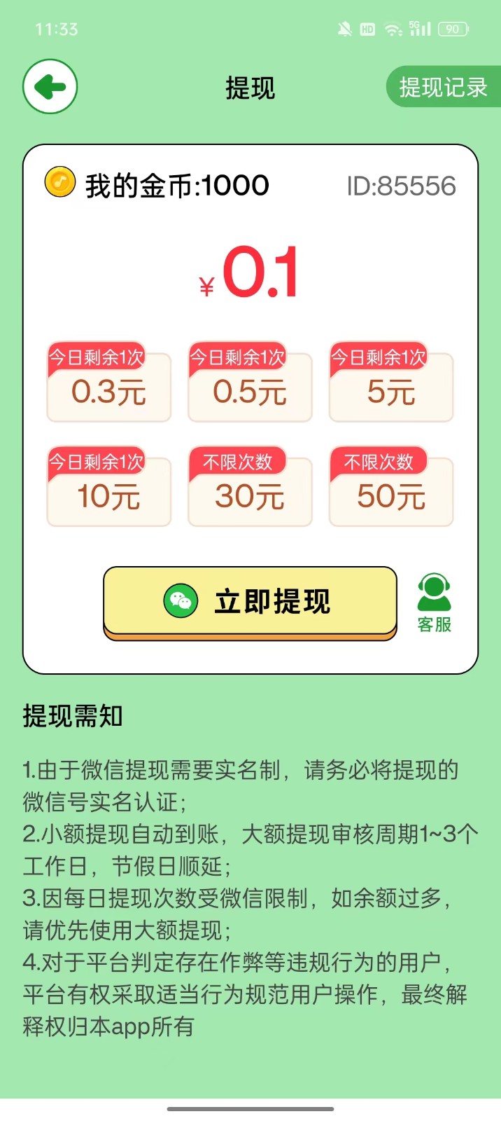 是的,猜歌赚多多真的可以赚钱也真的可以提现,领到的红包都能提现,满0.3就能提现