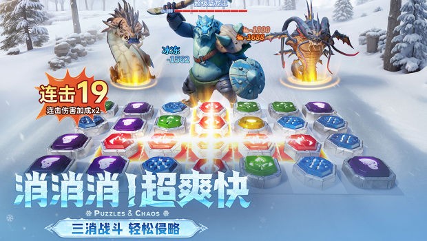 3、三消和英雄卡牌相结合的战斗系统,增加属性克制玩法和策略玩法。