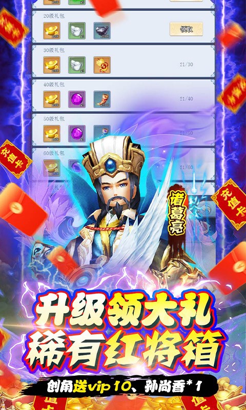 升级送大礼:每提升十级可领取一次等级礼包,直领稀有红将宝箱