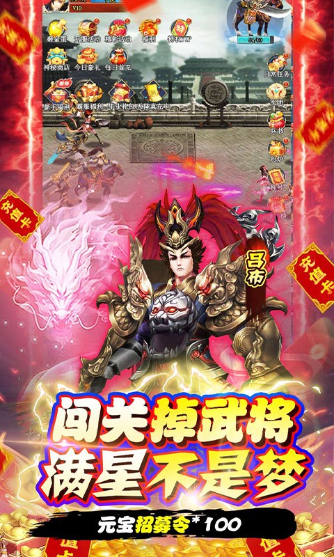 霸者归来挂机送充值是一款三国题材挂机卡牌手游,在霸者归来挂机送充值中,玩家上线就可以领取vip10、孙尚香*1、元宝招募令*100、劈山套装宝箱*1、银币*88888,次日登录还送红将马超、阿斗等,每天签到、闯关、升级都有大量福利可以领取