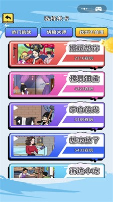 找茬老六是一款烧脑解谜闯关小游戏,挑战你的记忆力和思维能力,破解关卡中的谜题,完成相应挑战,享受游戏的快乐。在找茬老六中,超多关卡随心选择,完成一系列任务,感受全新乐趣体验。