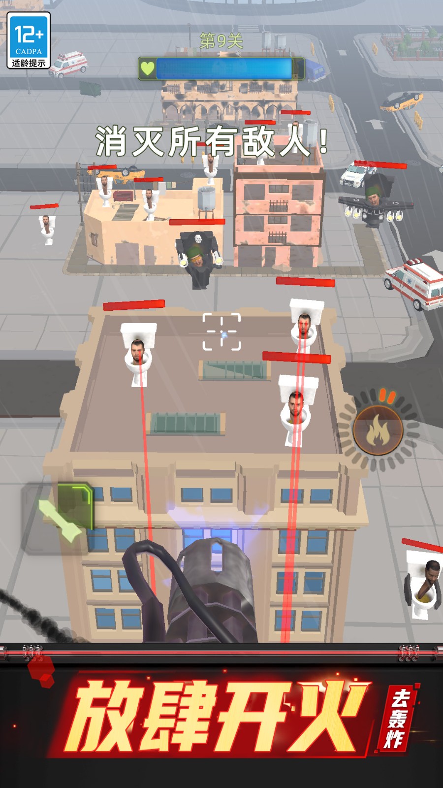 1. 一群滑稽的马桶人突然出现在基地周围,你的任务是将他们消灭,维护基地的和平。