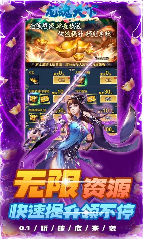 龙魂天下永久0.1折是一款超爽挂机仙侠手游,在龙魂天下永久0.1折中 ,玩家上线直接免费领首充、极品光武·龙璇、颜值时装·清霜如镜,还有GM和VIP双重特权可以领取,每日可以领海量元宝和材料,还有大量充值卡可以领