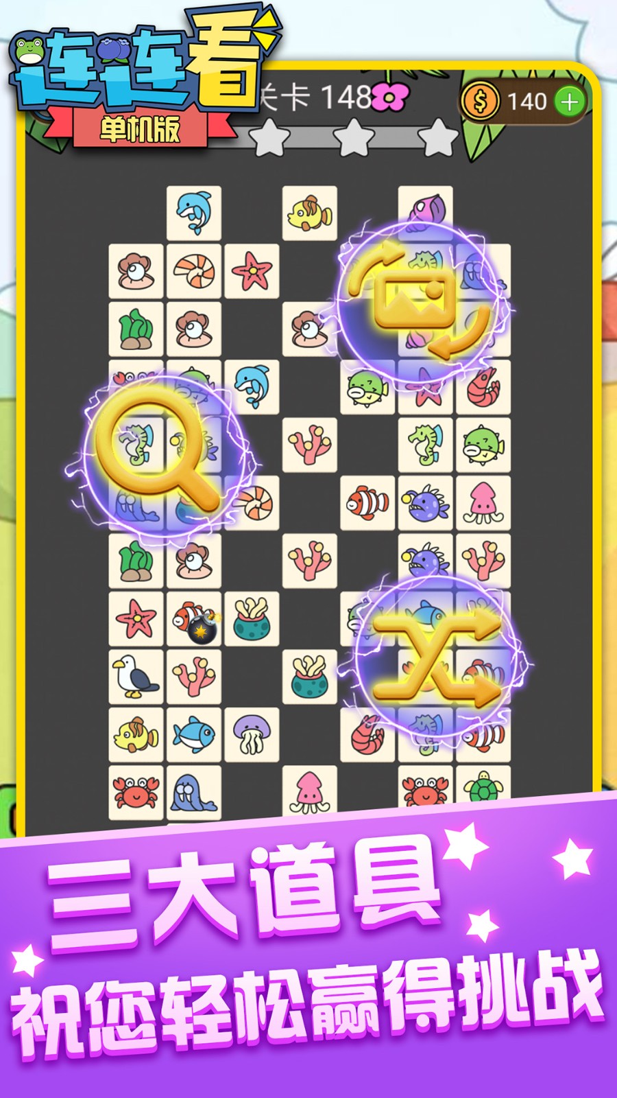 连连看单机版是一款经典休闲闯关游戏,在连连看单机版中,有上千道关卡可供玩家挑战,丰富的主题关卡给玩家不一样的方块图案,三大道具助力玩家轻松消除,丰富奖励等你来赢取,不用网也能玩的连连看