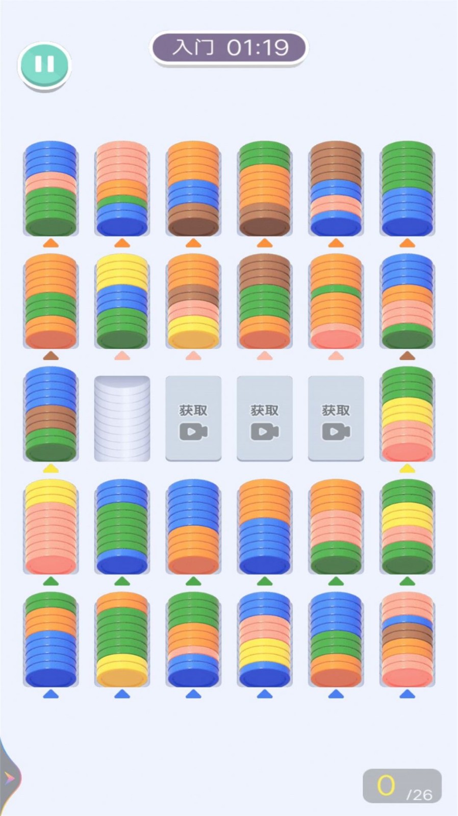 1.创意分类消除游戏,玩家需要将所有相同颜色的圆盘划分在同一个凹槽中