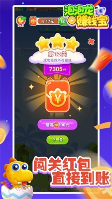 1.将同颜色的泡泡对齐,消除这些泡泡,得到分数并通关,每完成一个关卡都能获得红包奖励,为你带来不同的乐趣体验。