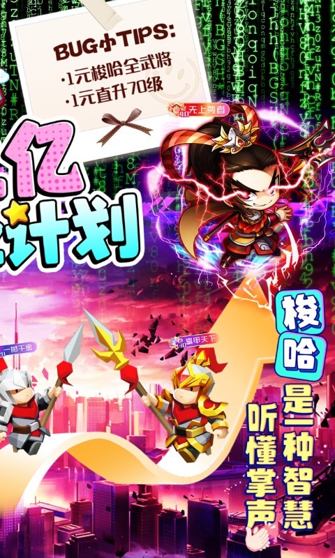 你们要的《挂机把主公》GM、BUG、0.1折版本特来了;没错就超级漏洞直接1分钱解锁70级;每天至少送20亿元宝;三国首富加量不加价;更有【云顶之亿】百亿补贴毕业计划,消耗元宝直接拉满BUG武将;开局梭哈,上线1分钱,解锁三国全武将;如此福利满堂,如此骄纵轻狂,你还不来吗?主公!