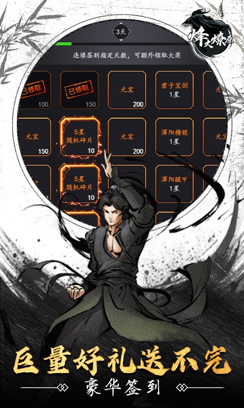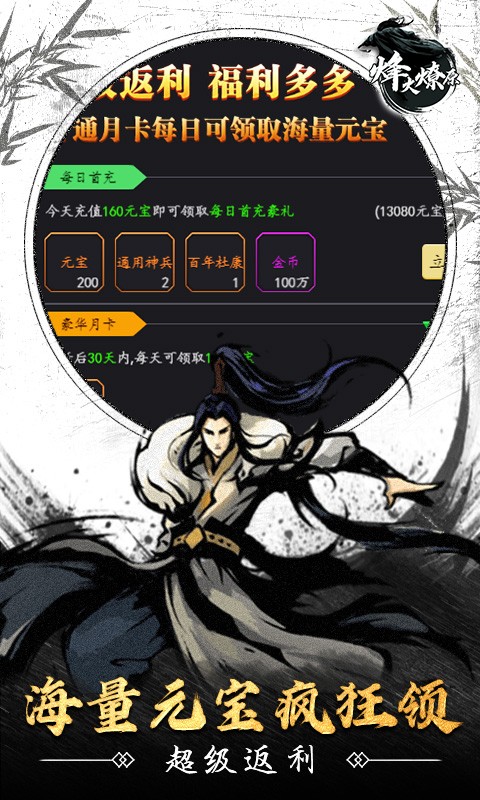 烽火燎原0.1折版是一款三国放置卡牌手游,在烽火燎原0.1折版中,不仅有完整的故事背景设定,同时还有大量的武将可以挑选,玩家每日上线签到即可领取丰富的资源奖励,极品装备靠打就有,离线挂机也能获得丰厚奖励