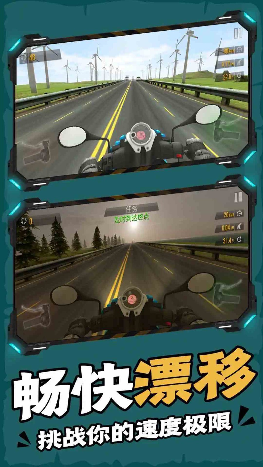 3.通过控制摩托车的加速、变向和刹车等操作,避开行驶车辆,达到终点