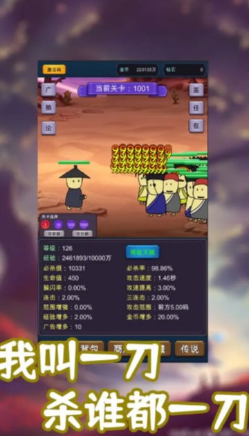 一刀必杀9999999游戏是一款放置挂机养成手机游戏,在一刀必杀9999999游戏内展开精彩挑战,完成不同的任务主线,自由进行签到,击败危险的敌人,横版的游戏画面风格,找准我们的机会,成功的确保我们的一刀必杀,梦幻对决一出就发!