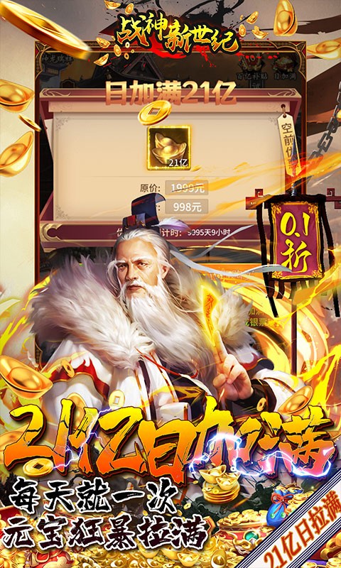 《战神新世纪(0.1百亿补贴日加满》在【0.1折】基础上再度迭代;【最强开局】梦幻登场,1分钱直接解锁三国全武将;超级【日加满】系统,不多废话直接拉满21亿元宝;【百亿补贴】主力毕业,不氪就能拉满,只要你玩,不要你氪!拉满工具【神机巧匠】上线,完全无门槛免费送装备、材料、资源、经验(主角)等,直接毕业点击就有;上线送5个5星武将,5套橙装,直接开干不解释;每天送5星,不抽也能变强;每天签到送1亿元宝,挑战30天花光30亿,至强装备等你来拿!