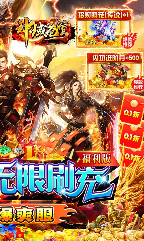 神域苍穹0.1折免费刷充是一款高爆打金传奇手游,在神域苍穹0.1折免费刷充中,玩家开局就可以领VIP15、招财萌宠(传说)、神器进阶丹(必成)、内功进阶丹,游戏内置无限刷充入口,可以免费领取元宝及VIP经验,每日签到还送真充卡
