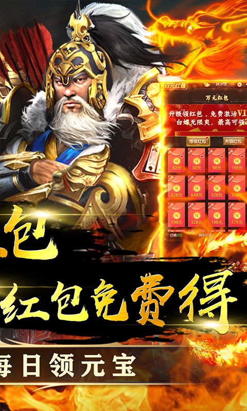 龙刃万元红包是一款三国养成经营游戏,在龙刃万元红包中,玩家上线即可领取超强武将关羽以及VIP15、30元首充卡和18万元宝,完成累计签到送神装宝箱、兽灵宝箱,升级还有万元红包免费得,VIP40免费激活