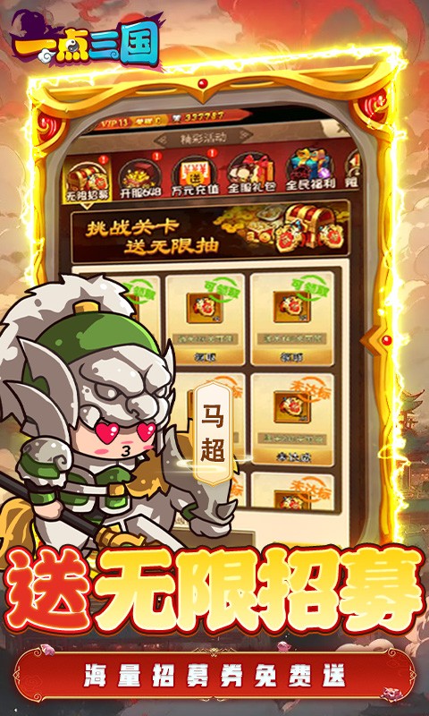 一点三国免费现金充值是一款三国挂机卡牌手游,在一点三国免费现金充值中,玩家登录就送满V特权、648元充值卡,赤金神将赵云,天天登录都有充值卡送,满30星赵云轻松养成,免费充值工具送10000元真充,打BOSS也能免费刷充