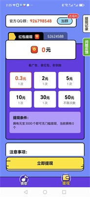 1.猜歌答题闯关领红包游戏,在有限的时间内,尽可能多地猜出歌曲,并争夺高分,享受轻松赚零花的快乐。
