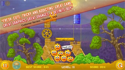 第六关:先用一个汽油桶把炸弹炸了,然后用轮子吧最上面的橙子滚下去,最后用汽油桶压在橙子上面就可以啦!