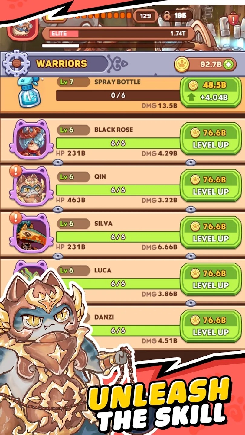 喵喵战士是一款放置冒险战斗游戏,在喵喵战士中,你可以召集英勇无畏的喵喵战士,与邪恶的敌人展开一场场惊心动魄的战斗,喵喵战士们不仅外形萌趣,还拥有着丰富的技能和个性,合理搭配好你的队伍,击退邪恶的敌人