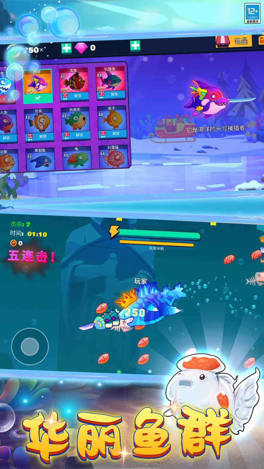 1.游戏内还为你提供了各种不同种类的小鱼,你可以在商店内进行解锁,同时可以解锁的物品还有小鱼的武器触角以及它们游过的痕迹效果