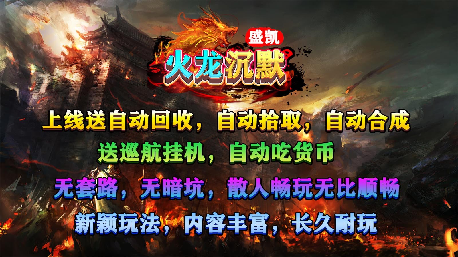 盛凯火龙沉默是一款185沉默传奇手游,在盛凯火龙沉默中,上线就送玩家自动回收、自动拾取、自动合成,还有巡航挂机和自动吃货币,对上班族也很友好的传奇,游戏无套路、无暗坑,散人畅玩可白嫖超多福利