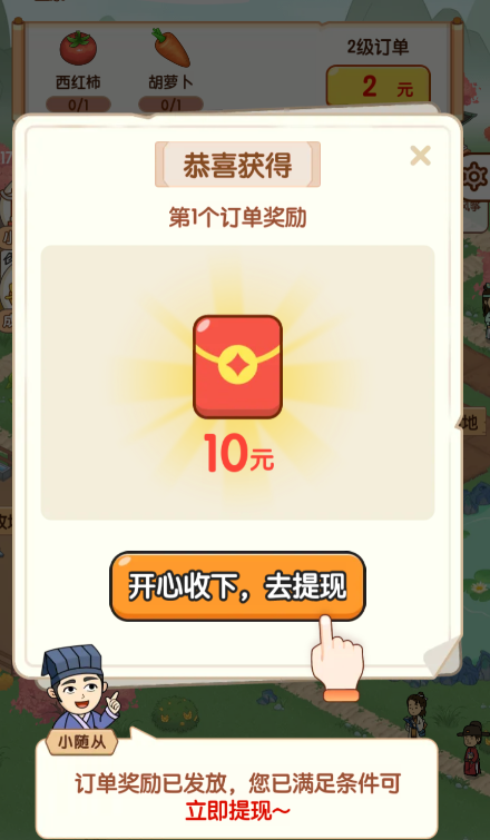 1.完成农场订单就可以领取红包奖励,订单等级越高红包金额越大