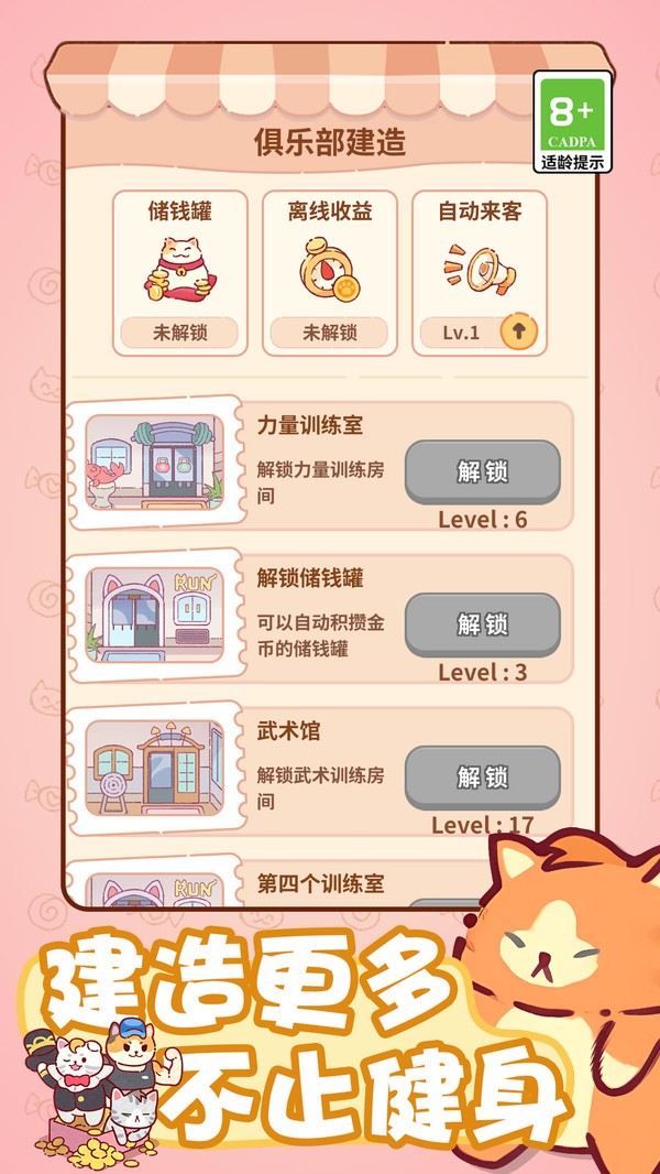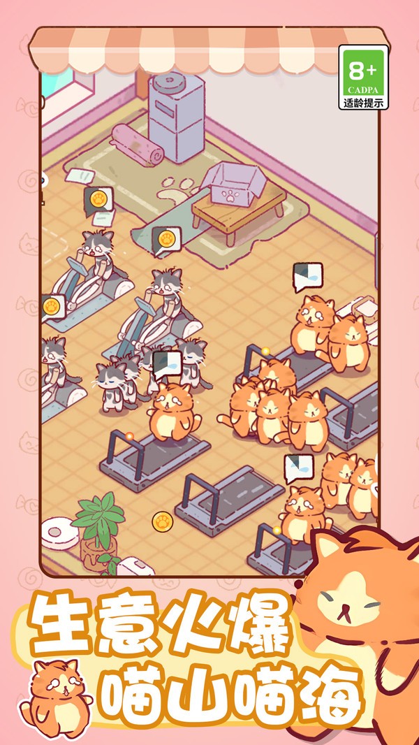 喵桑向前进是一款健身俱乐部经营游戏,在喵桑向前进中,玩家将为猫咪们打造一个健身房,为猫咪们控制体重、保持身材提供各种健身器材和塑身计划,吸引更多的猫咪前来健身房运动,解锁更多可爱的小猫图鉴,同时获得丰厚收益