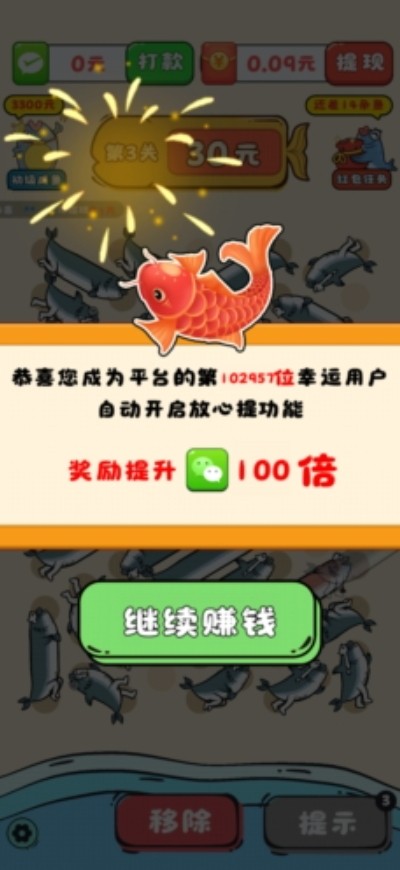 1.将关卡中所有的鱼全部移动消除即可获得通关奖励,每一关都有对应的红包金额奖励