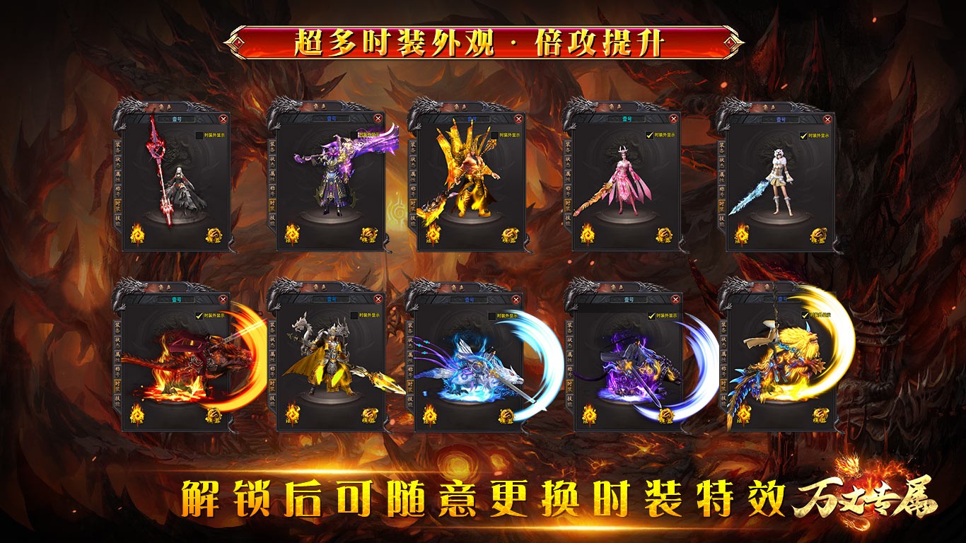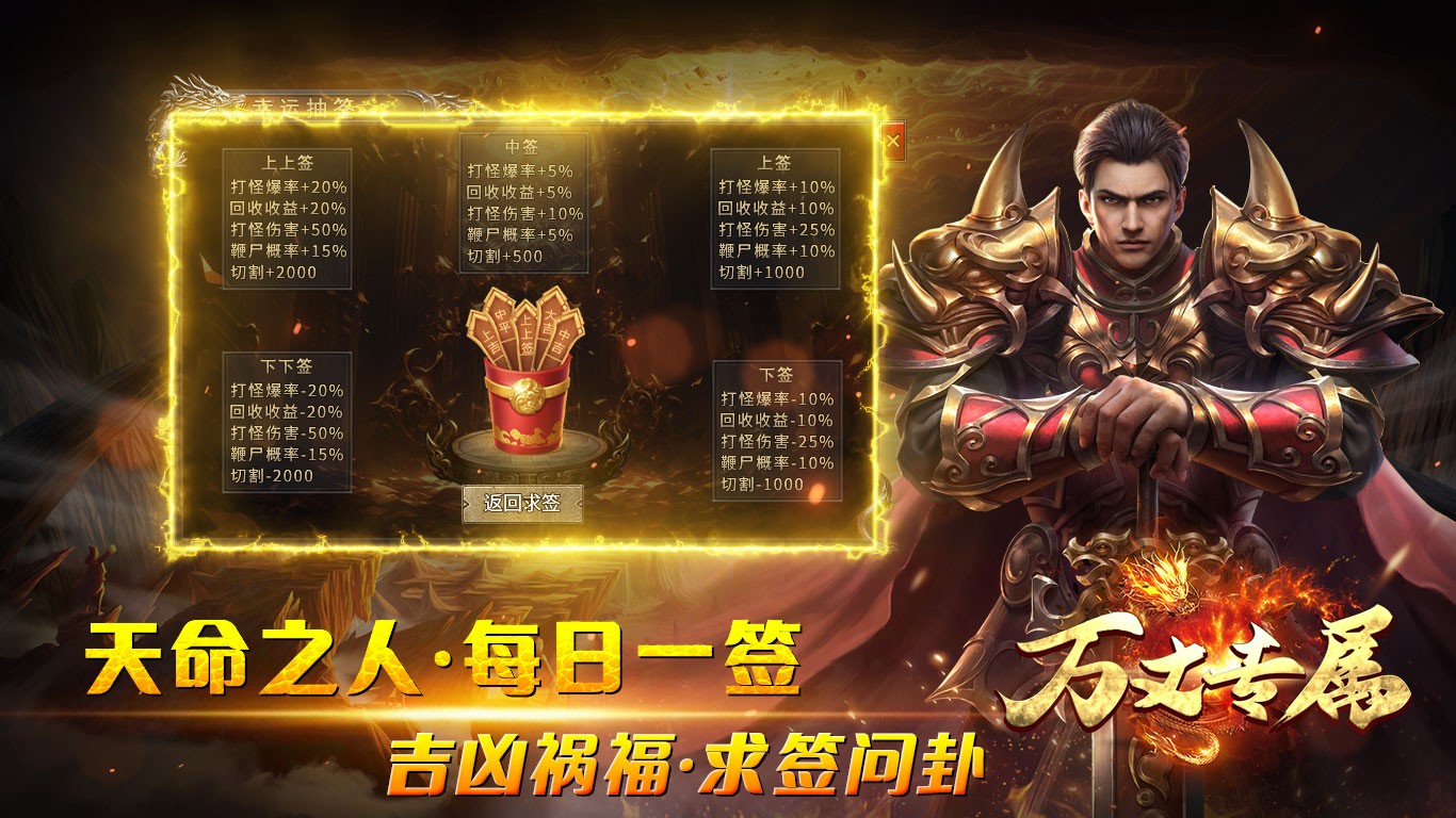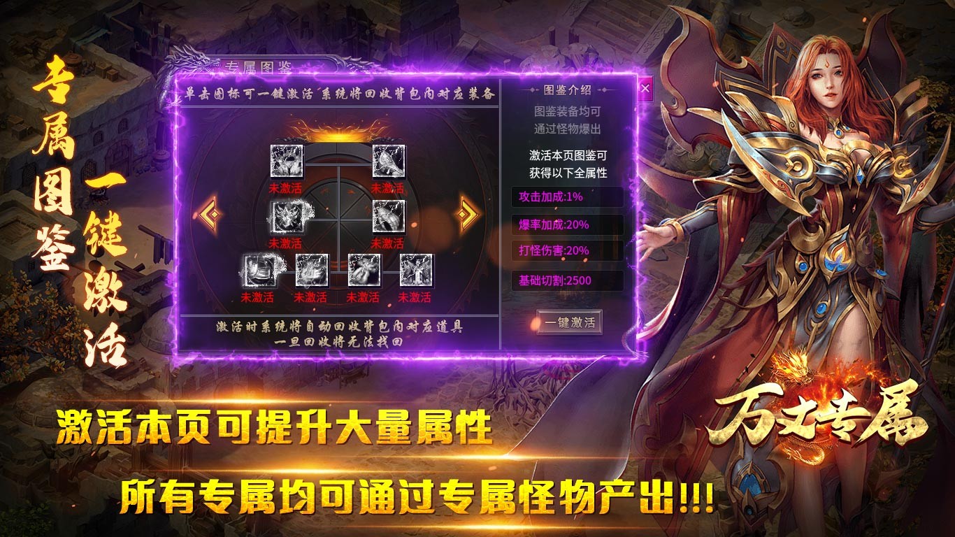 万丈专属是一款全新沉默专属版本传奇手游,在万丈专属中,赠送自动回收、范围捡物精灵、随身仓库,全部永久免费,超多专属地图,每个地图独立专属怪物都很好打,游戏内无冠名、无日充、无合区礼包、所有装备、道具、材料均可打怪掉落