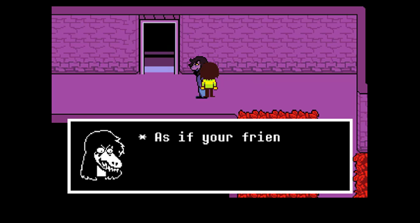 一路尾随Toriel直到下界的门前,需要多次与其争吵,她才会继续前行。