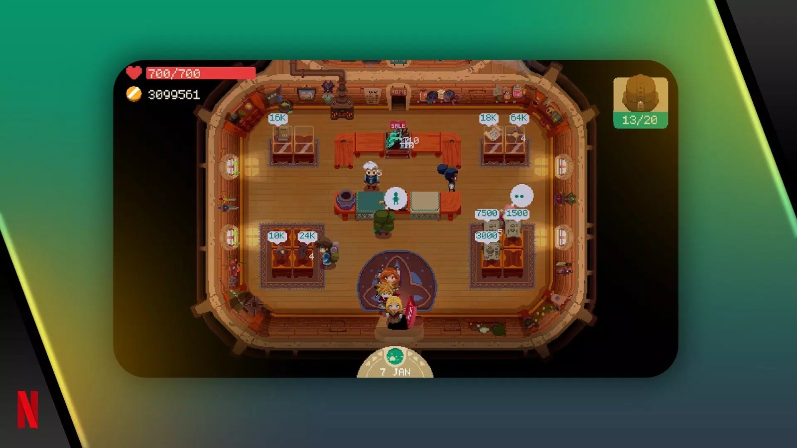 NETFLIX夜勤人是一款像素风rpg探索冒险游戏,你将扮演一名商店老板,夜晚化身冒险者,探索地下城,开启全新的冒险之旅。在NETFLIX夜勤人中,两个世界的奇妙冒险,各种玩法随心选择,带给你不一样的乐趣。