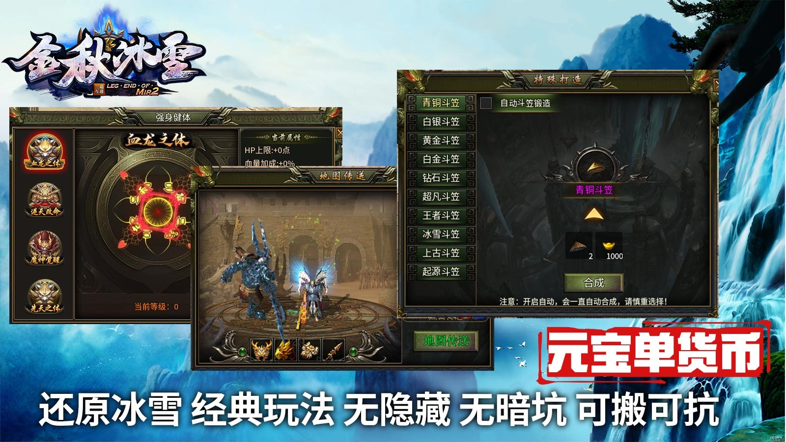 金秋冰雪是一款三端互通的185冰雪传奇手游,在金秋冰雪中,采用单货币形式,元宝就是本服唯一货币,游戏内无礼包、无直购,所有材料装备全部靠打,超大生态玩家可以自由交易,散人一样能得终极