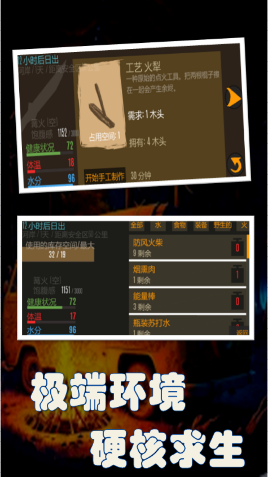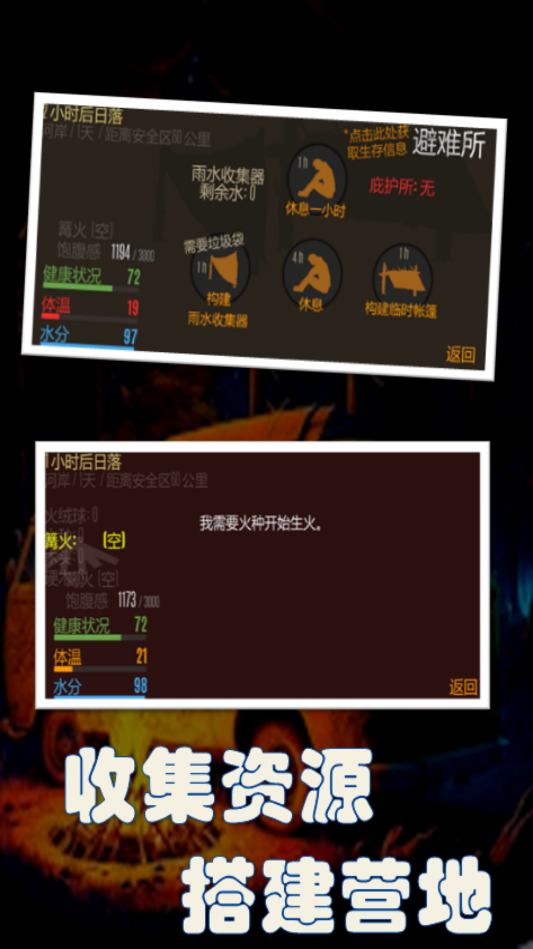 3.荒野中隐藏着各种资源和危险,玩家需要探索环境,寻找食物、水源和庇护所。