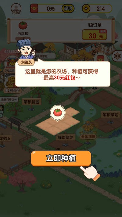 农趣乐耕是一款放置种田领红包游戏,在农趣乐耕中,回归田园生活,经营你的庄园,种植各种作物,等待作物成熟,完成一系列的经营任务,赢得丰厚的红包奖励,享受愉快的游戏过程。