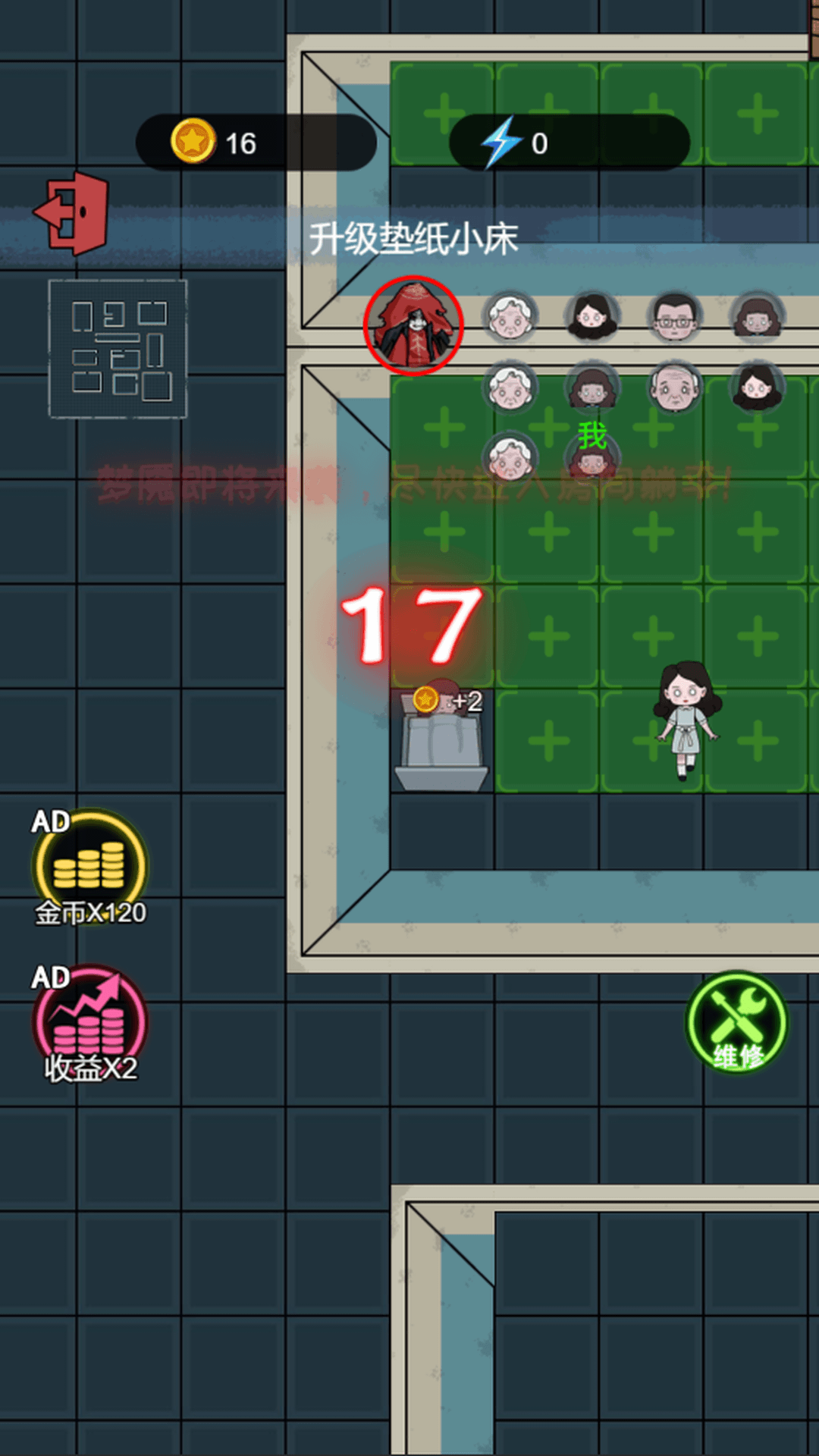 2.逐步积累金币,升级宿舍防御设施,布置陷阱,以抵御猛鬼的侵袭