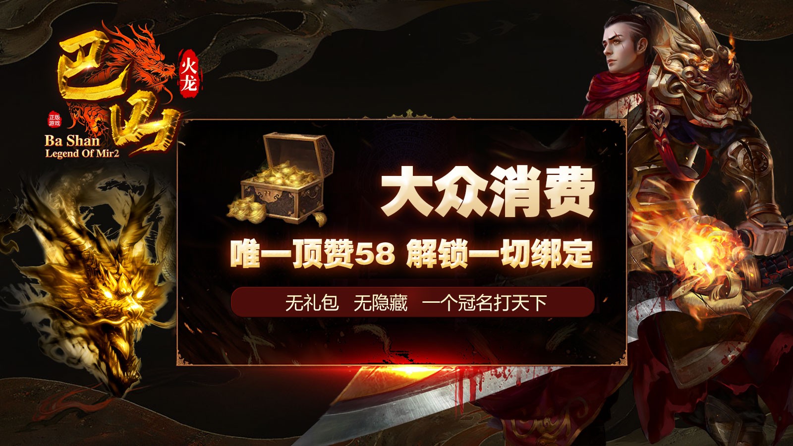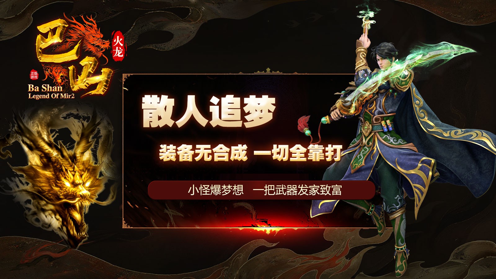 巴山火龙是一款180火龙单职业传奇手游,在巴山火龙中,金币、材料、装备全部靠打,超多地图可以免费进,散人地图、副本地图、上岛决战,装备无合成,一切全靠打,一个人也能单挑BOSS,屠龙抽奖金币、稀有材料赚不停