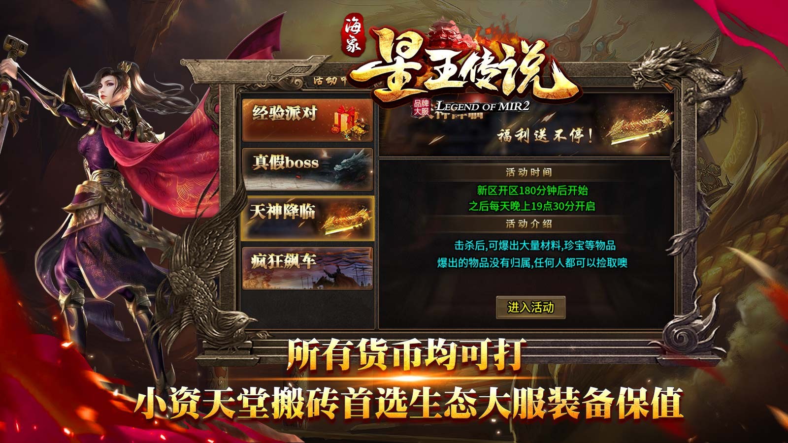 海象星王传说是一款1.85三职业传奇手游,在海象星王传说中,自动回收,自动捡物全部免费,海量红包等你解锁。玩法多样,各种材料以及货币都可以打金,时间就是一切。