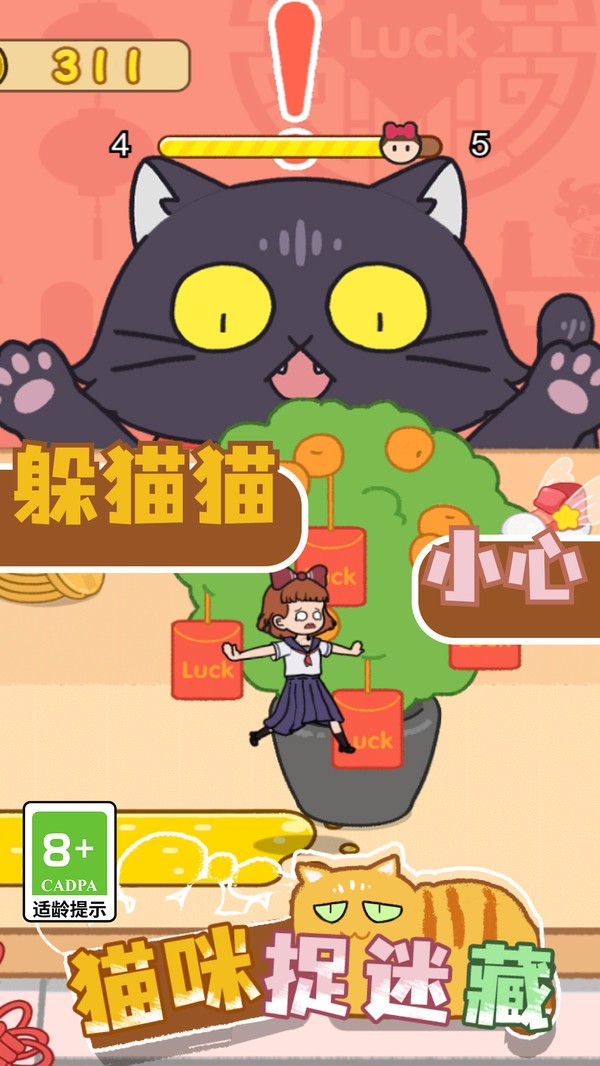 这是一款以可爱的猫咪为主角的休闲有趣的捉迷藏游戏,在游戏中玩家将扮演一只聪明的小猫,在各种有趣的场景中与它的主人玩捉迷藏,你需要巧妙地利用环境,有各种物体和障碍物来躲避主人的视线,你还需要解决一些简单的谜题来帮助你更好地隐藏,游戏有着温馨的画面和轻松的背景音乐,非常适合全家人一起玩,享受温馨的亲子时光,充满无限欢乐。