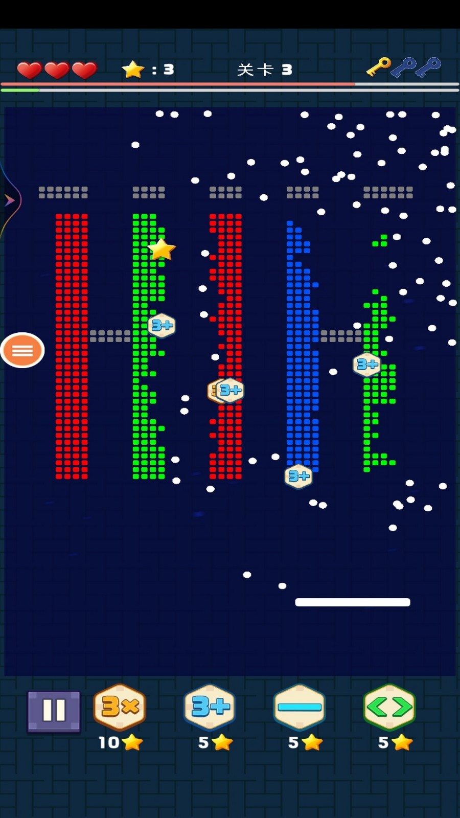 3.利用小球击打砖块,消除所有砖块,只需简单的移动操作,即可控制挡板,轻松上手。