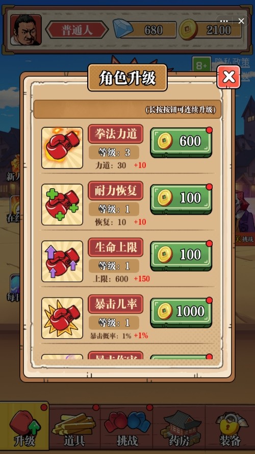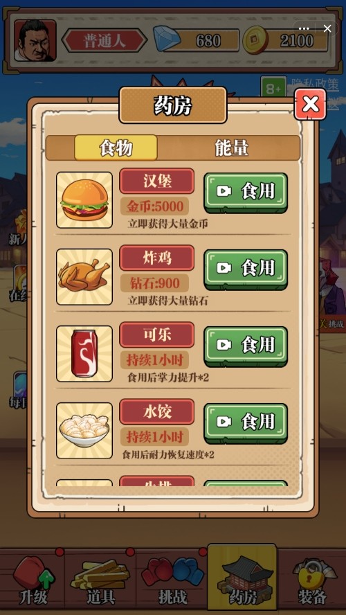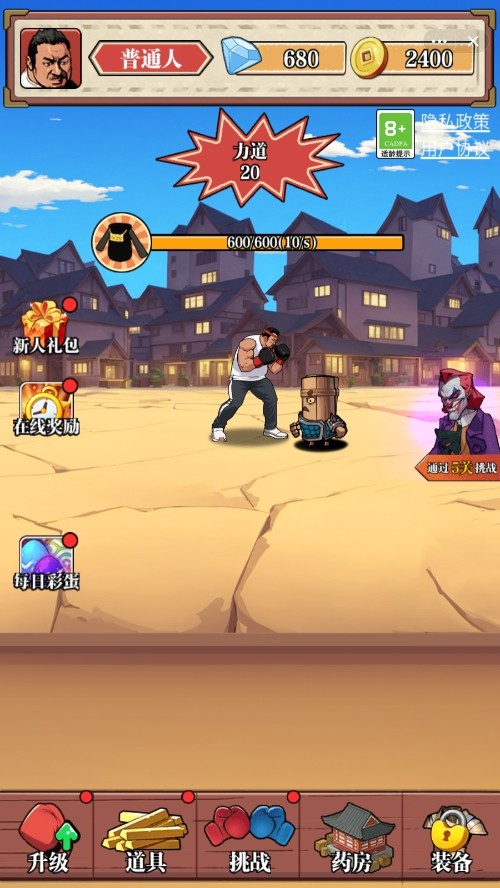 2.逐步解锁砖头道具,锤炼掌力,也可吞服灵丹妙药获得强化增益