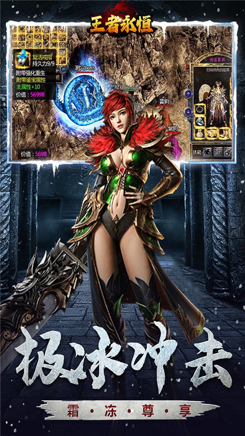 王者永恒传奇手游是一款经典复古题材手机传奇小游戏,在王者永恒传奇手游内遨游精彩冰雪世界,所有地图内容都被冰雪特效覆盖,首次登录的玩家将获得88888元宝,新玩家将额外获得10万元宝。 自动回收、开天斩、日常剑法免费赠送,超值的装备,极致的享受,即使是个人也可以追求自己的梦想。