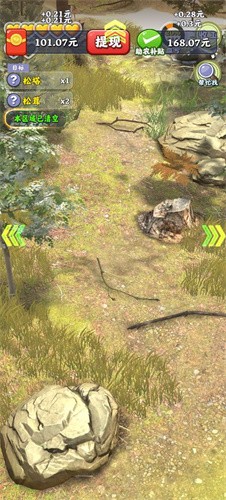 2、选择前往,来到山里面,可以依据提示,快速收集松茸、香菇等山货,记得去点击出现的箭头,可以四处寻找,还能拿开石头、除草,会有想不到的意外收获。