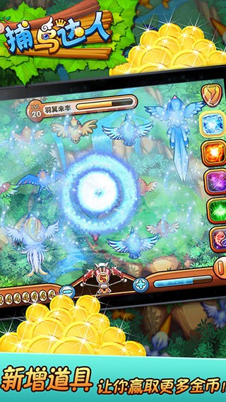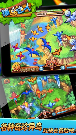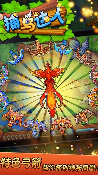 捕鸟达人经典原版是一款类似捕鱼玩法的手机休闲小游戏,在捕鸟达人经典原版内开启你的捕鸟之旅,拥有各种精美的场景,包括大片的绿色森林、蔚蓝的天空和小湖泊,精美细腻的游戏画面给你安静的体验,有不同的鸟叫声和不同的珍贵鸟类种类,玩家需要从龙舌弓、诸葛连弩、霸王弓、轩辕弓、落日弓等捕鸟武器中选择一种作为自己的捕鸟神器,并使用武器猎杀小鸟。