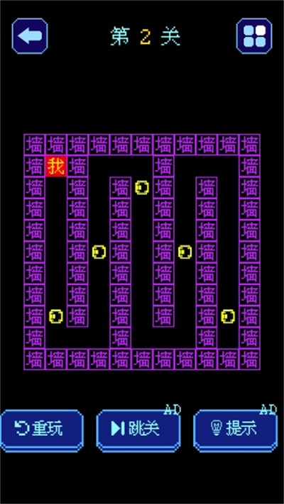 这是一款风格简单的解谜迷宫挑战游戏,玩家需要帮助“我”找到正确的路线通过关卡,并按照玩家规划的路线吃到最后的金豆,玩家在规划路线时需要注意墙壁和各种障碍物,还需要躲避“鬼”的追击,快来挑战吧。