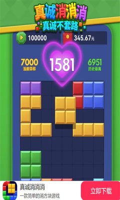 真诚消消消是一款消除闯关领红包游戏,在真诚消消消中,经典消除玩法,融入俄罗斯方块元素,拖动方块轻松消除,完成任务领取超多红包奖励,带给你不一样的乐趣体验。